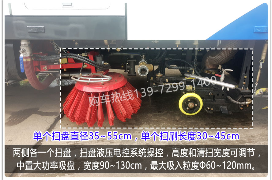二、上裝配置: 1、帶2個(gè)中置掃盤(pán);中置超寬吸嘴;雙層吸塵筒;康明斯170馬力副發(fā)動(dòng)機(jī),3800軸距多利卡配江鈴64kW增壓副發(fā)動(dòng)機(jī);臺(tái)灣液壓閥;大力馬達(dá);德國(guó)高壓水泵(前沖/側(cè)噴/中噴/后噴霧)/側(cè)沖洗水槍/垃圾箱自潔裝置);萬(wàn)向高壓路沿清洗;威龍低壓泵(前沖),氣動(dòng)球閥控制;4mm不銹鋼垃圾箱;不銹鋼水箱;德國(guó)控制器;尾部箭頭燈;機(jī)油、垃圾箱、水箱均帶防溢或低位報(bào)警裝置;倒車(chē)及洗掃狀態(tài)室內(nèi)監(jiān)視器;多種語(yǔ)音提示;倒車(chē)自動(dòng)保護(hù)、防傾倒垃圾翻車(chē)保護(hù)、檢修安全保護(hù);20m高壓沖洗卷盤(pán);刷臂轉(zhuǎn)動(dòng)機(jī)構(gòu)使用德國(guó)進(jìn)口高新耐磨工程隔套